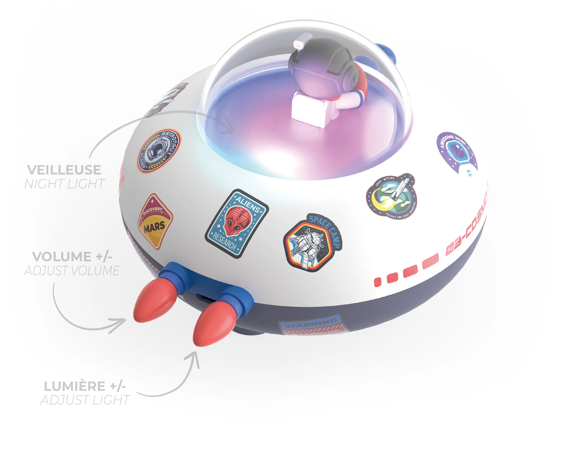 Cosmo Bubbly nije samo običan Bluetooth zvučnik – to je prava umjetnička sprava, svijetleći pratilac koji unosi zvuk i stil u vašu svakodnevicu. Bilo da ste ljubitelj muzike, tehnologije ili neobične dekoracije – Cosmo Bubbly će vas očarati svojim jedinstvenim šarmom i odličnim performansama, Pruža snažan zvuk i svjetlosne efekte do 4 sata. Idealan i kao noćno svjetlo – stvara opuštajuću atmosferu uz 3 različita režima svjetla. Uz to, mališani ga mogu personalizovati sa čak 50 naljepnica koje dolaze u paketu.