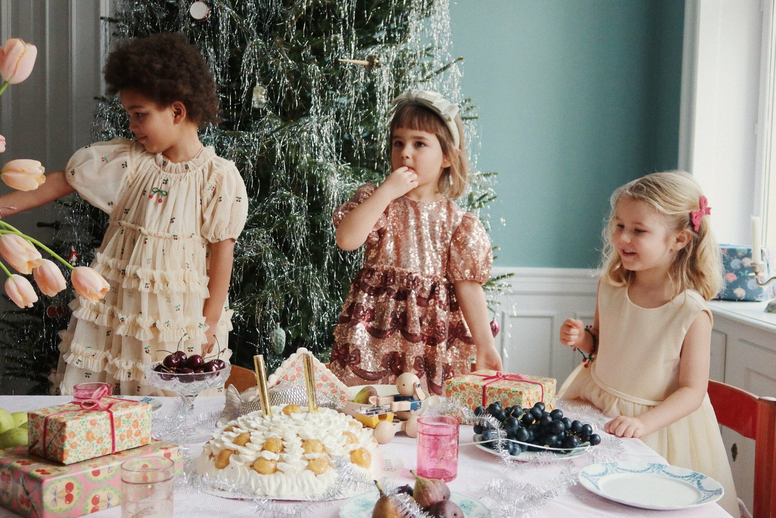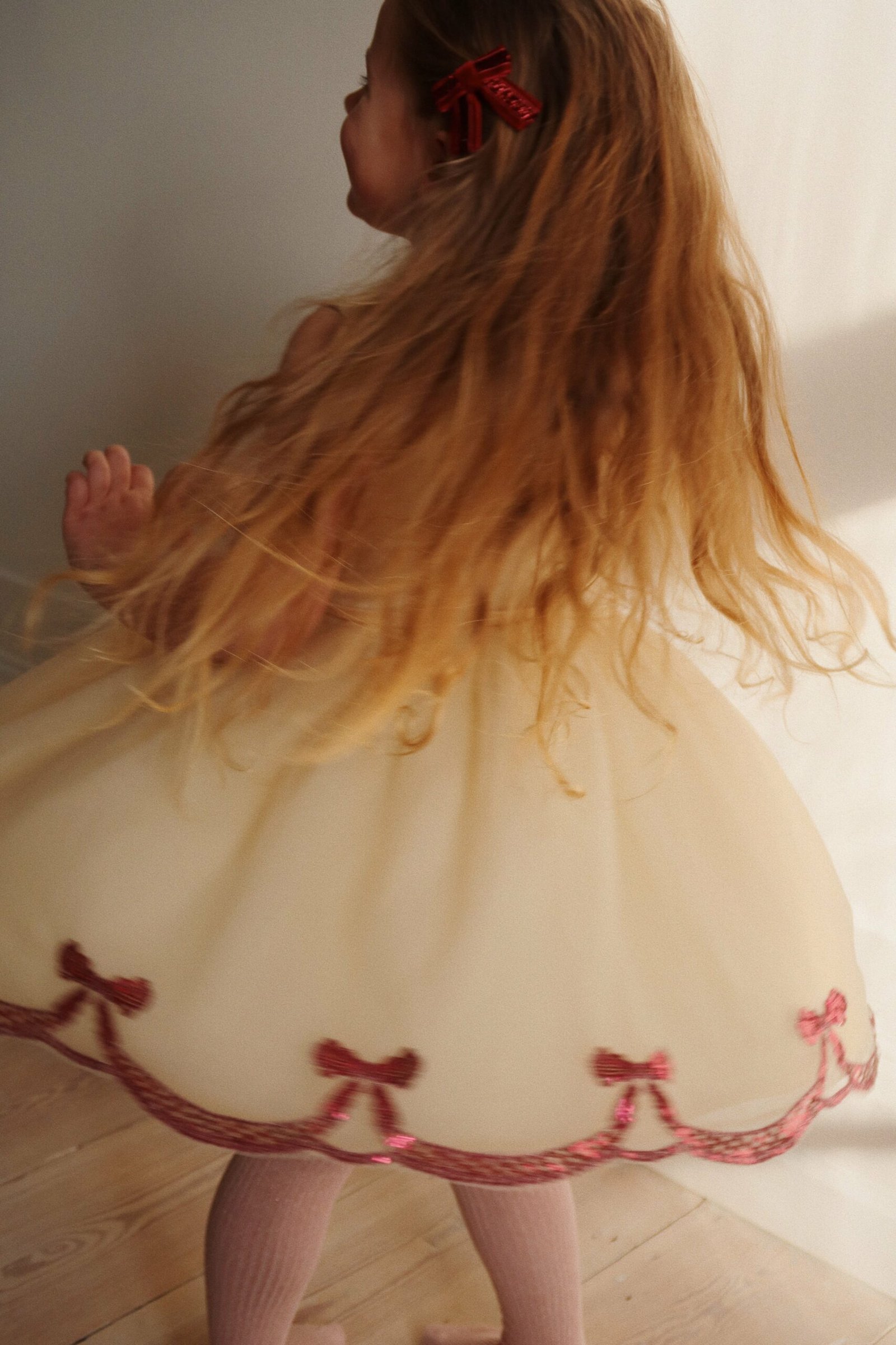 Dječja haljina iz kolekcije Konges Sløjd. Širi se prema dolje. Model izrađen od tkanine s aplikacijom.