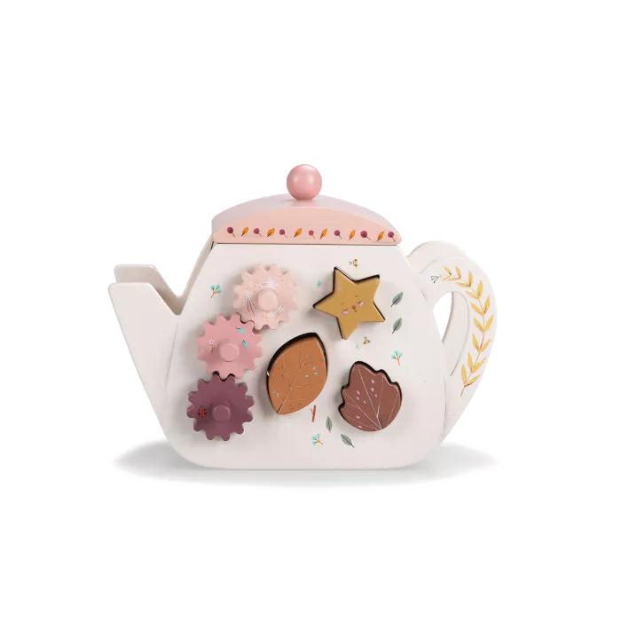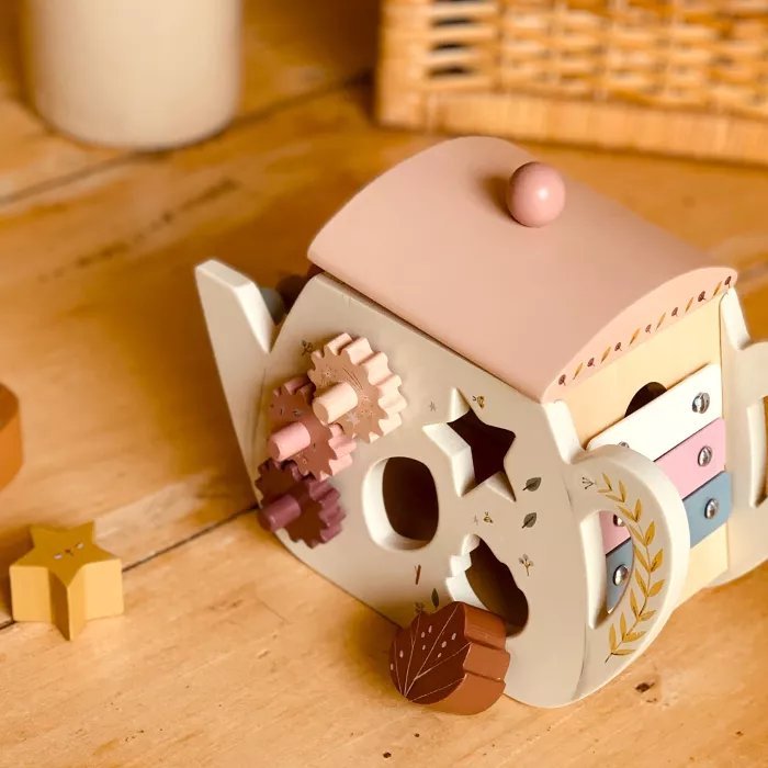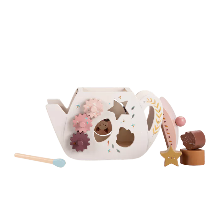 Evo predivnog drvenog čajnika sa aktivnostima za bebu! Svaka od 4 strane donosi zanimljive igre i priliku za učenje: abakus, oblici za umetanje, zupčanici za okretanje, ksilofon…