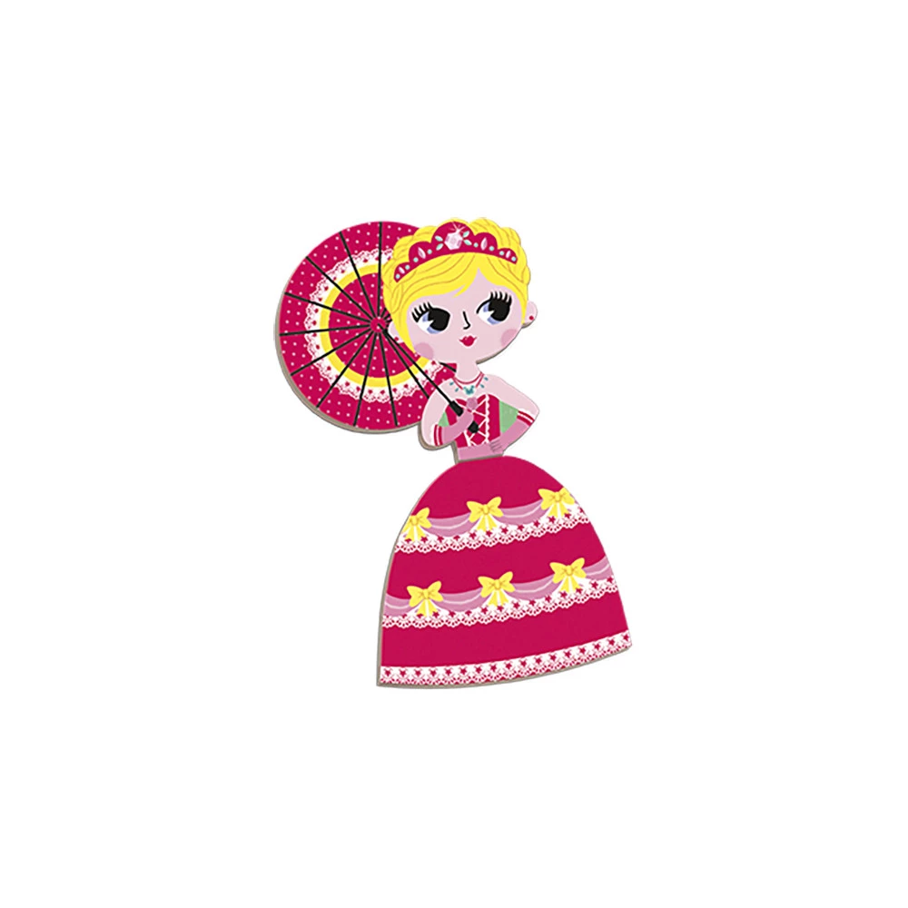 Magnetna edukativna igra od kartona na temu princeze. Sastoji se od 55 magneta i 7 kartica. Nakon što se knjiga otvori, cilj je da se na sceni napravi ista scena kao što je naznačeno na kartici zahvaljujući magnetima. Ovaj proizvod je napravljen od FSC® certificiranih i drugih kontroliranih materijala.