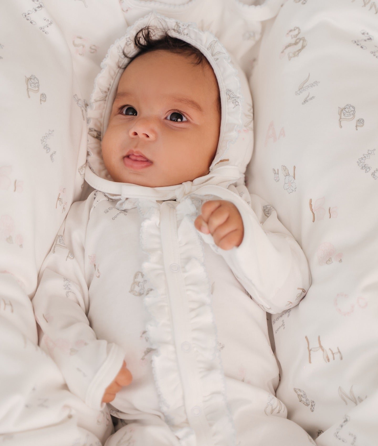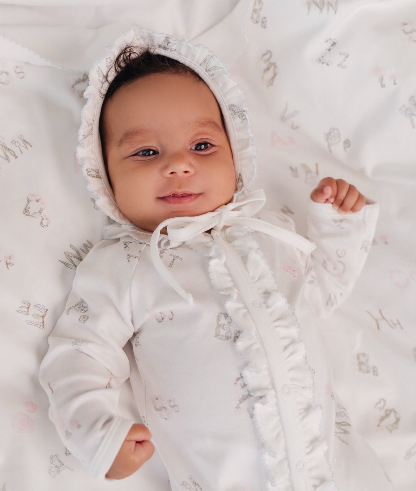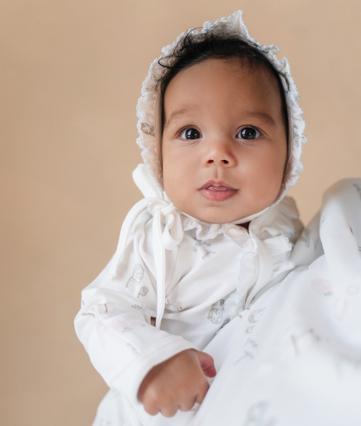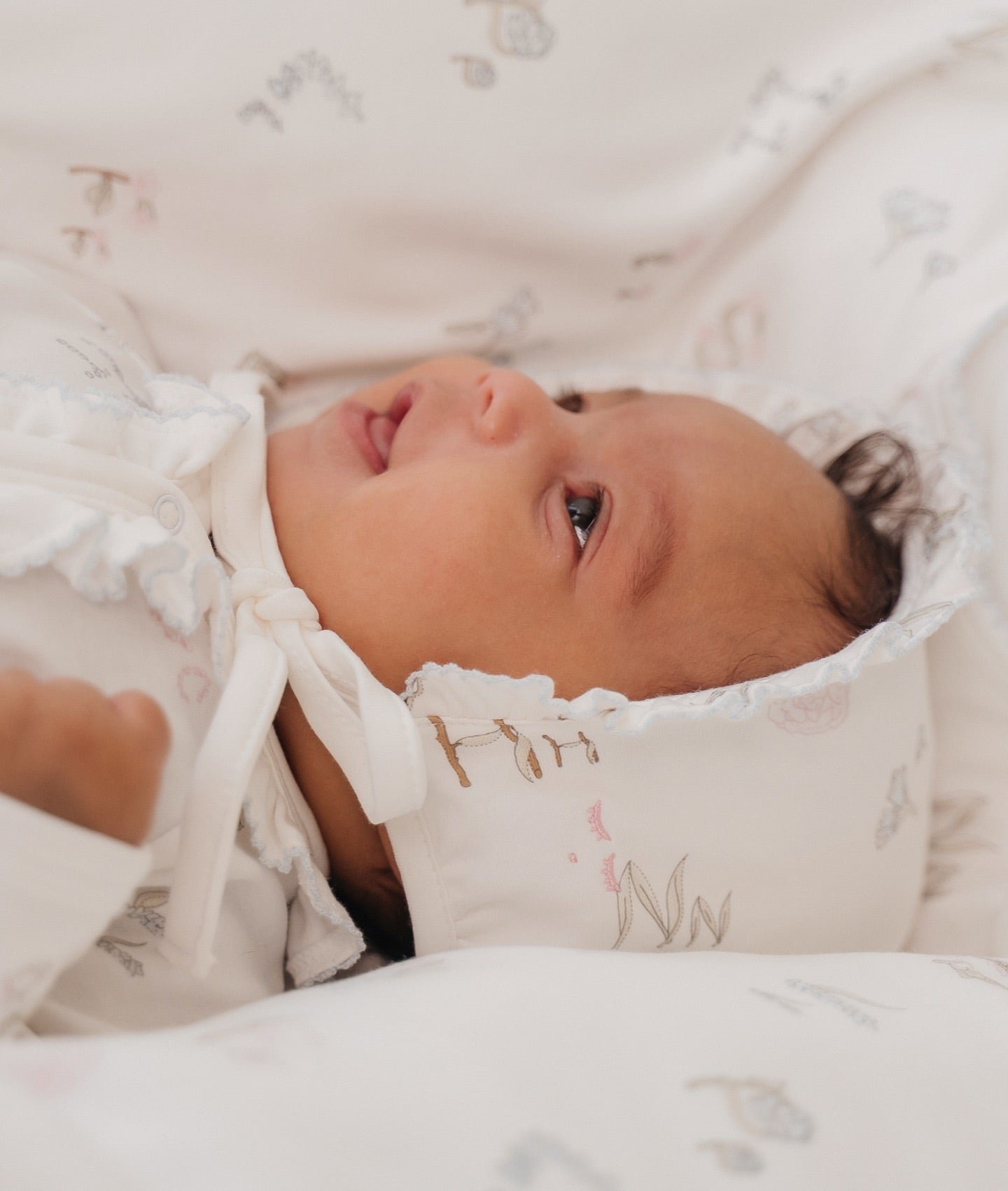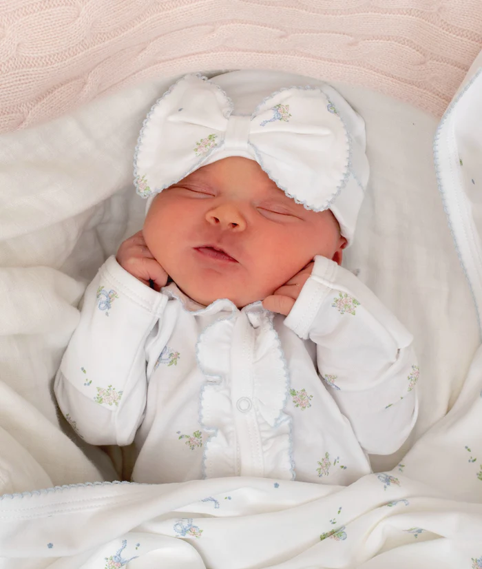 Ova slatka bijela kapa s volanima i cvjetnim motivima pruža zaštitu od sunca i dodaje šarm svakom outfitu. Izrađena je od mekog pima pamuka, idealna za osjetljivu bebinu kožu.