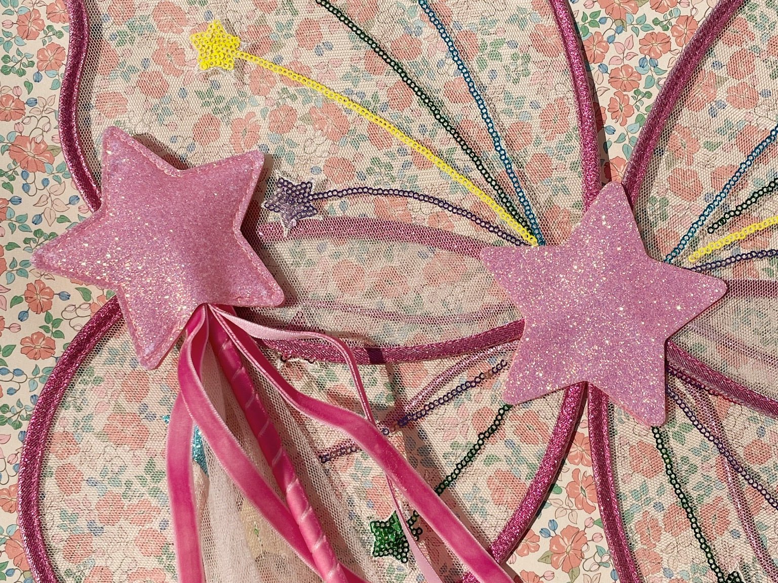 Kostim vile: Krila i štapić od Konges Sløjd-a je oličenje dječje magije i profinjenog dizajna. Impresivna krila u obliku leptira, izrađena od izuzetno nježne, prozirne mreže, elegantno su uokvirena na ružičastoj metalnoj strukturi. Očaravajući, blistavi raspored raznobojnih zvijezda i svjetlucavih traka skladno ističe lakoću i maštu ove kreacije. Izgled je upotpunjen svjetlucavom zvijezdom i svjetlucavim trakama postavljenim centralno. Štapić, ukrašen akcentima od tila i prekriven ružičastom zvijezdom, upotpunjuje ovu sofisticiranu kompoziciju. Proizvod nema vanjskih oznaka, što naglašava njegov jedinstveni, umjetnički karakter.
