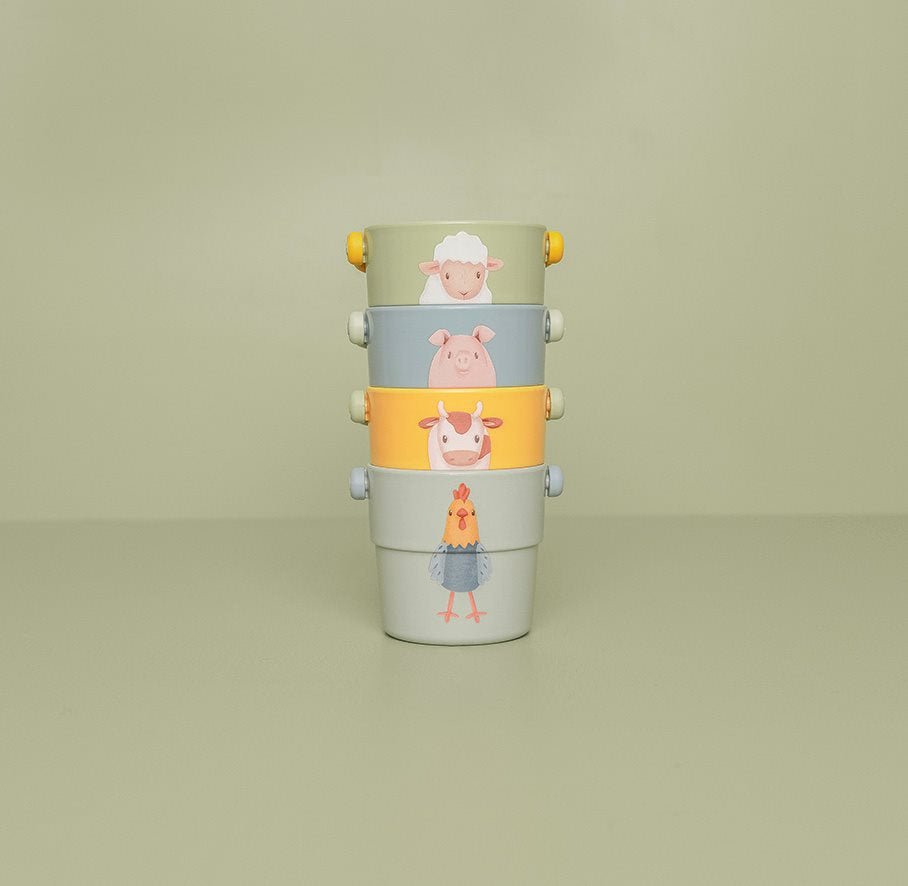 Složite, napunite, sipajte i PRSKNITE! Vaš mališan će još više uživati u kupanju s ovim setom od 4 čašice za kupanje. Dolaze u 4 različite boje i ukrašene su najslađim životinjama s farme iz kolekcije Little Farm. Tu je čašica za kupanje s ovcom, svinjom, kravom i pijetlom. Veličina je taman za male ruke, a igranje s malim kanticama pomaže u razvoju motoričkih sposobnosti. Složite ih jednu na drugu kako biste izgradili veliki toranj ili ih prevrnite. Ili ih napunite vodom i gledajte kako različiti oblici izlaze.