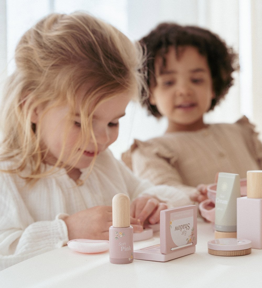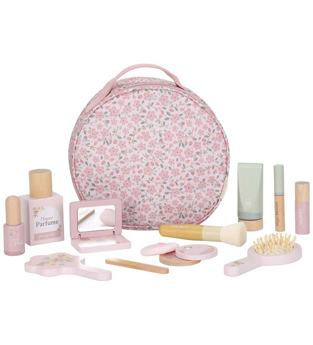 Šarmantni Little Dutch set za šminkanje s drvenim proizvodima za šminkanje i mekom torbicom za šminku. Little Dutch set za šminkanje uključuje razne dodatke poput ogledala, četke za kosu i kistova, dizajniranih za male kreativne bajke.