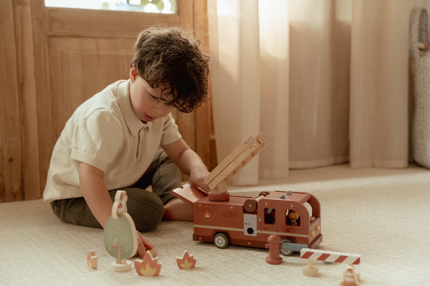 Ovaj drveni vatrogasni kamion ima stube koje se mogu produžiti i odvojivo crijevo koje možete povezati sa hidrantom ili vatrogasnim kamionom. Uključuje četiri vatrogasca, plamen i hidrant. Savršeno za kombinovanje sa vatrogasnom stanicom za još više zabave!