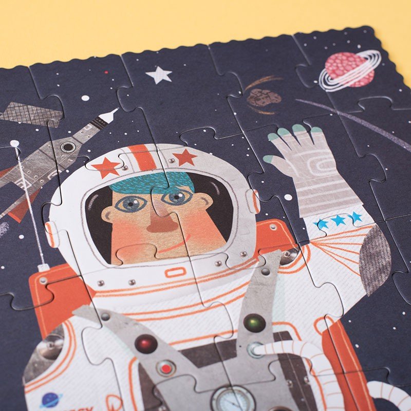 Unutar kutije naći ćeš 4 puzzle sa 9, 12, 16 i 20 dijelova. Na ovaj način dijete može postepeno povećavati nivo težine. Set je upotpunjen sa dvoje obojenih naočara (jedne crvena i jedne plava). Kada se puzzle sastave i pogledamo kroz naočare, otkrićemo skrivene likove i mala iznenađenja.