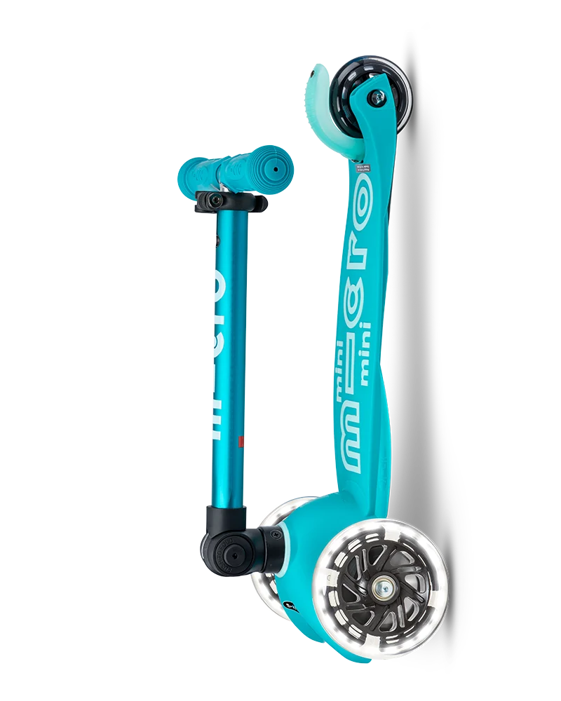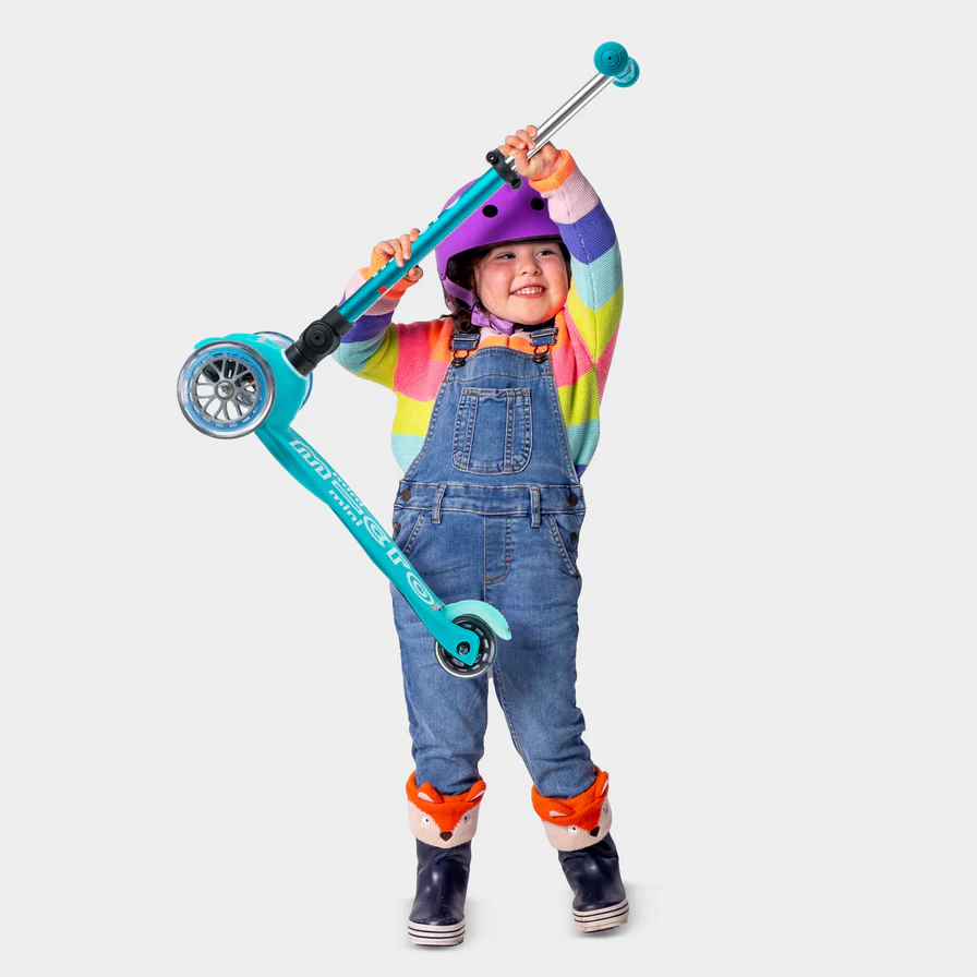 Mini Micro Deluxe Foldable LED Aqua je lagan, siguran i izuzetno praktičan trotinet dizajniran za najmlađe vozače. Svježa Aqua boja u kombinaciji sa LED svijetlećim točkovima daje mu moderan i razigran izgled, dok svijetleći efekat povećava vidljivost i dodatno zabavlja djecu tokom vožnje.