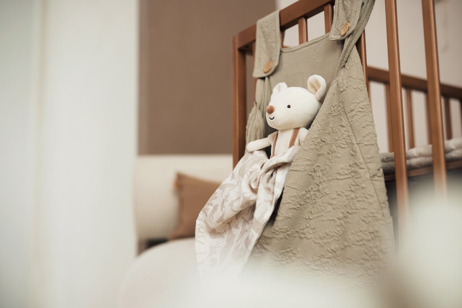 Nema ničeg toliko frustrirajućeg kao nered u dječijoj sobi. Plišane igračke, druge igračke i male knjige svuda po prostoriji. Uz ovu praktičnu torbu za skladištenje, lako možete pospremiti sve, a ona će izgledati vrlo stylish u najudobnijoj sobi u domu. Print na torbi za skladištenje su naborane talasaste linije iz Soft Waves teme. Da li vas meki tonovi čine srećnim? Torbu za skladištenje možete kupiti u bojama Olive Green i Nougat, koje će se uklopiti u svaku sobu. Savršeno možete uskladiti veliku torbu sa malom iz Soft Waves teme. Napravljeno od OEKO-TEX certificiranog pamuka.